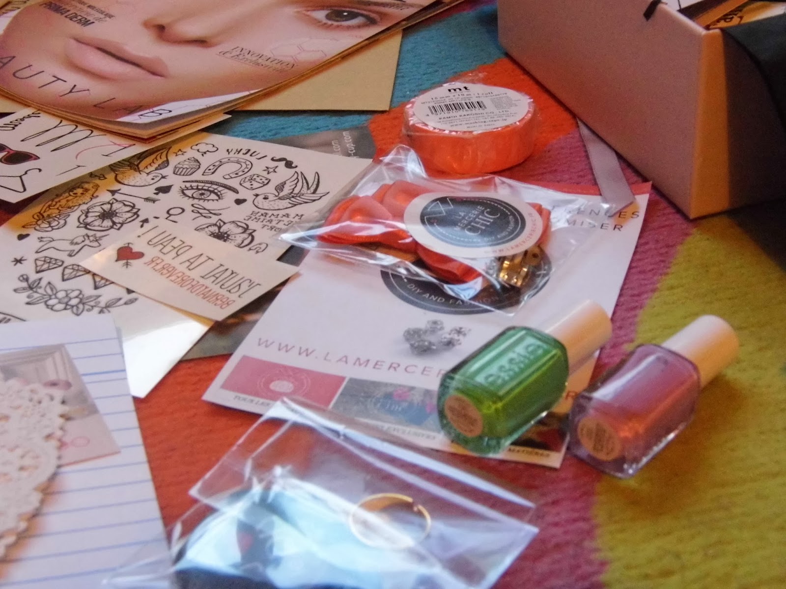 Nous avons toutes recues un tote bag énooorme ! Avec une glossybox, des tatouages bernard forever, des vernis Essie, la mercerie chic, et j’en oublie encore !