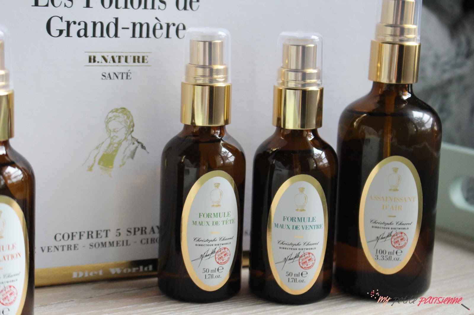 Je pense utiliser cette formule au bureau au moment où tout le monde est malade pour éviter d’avoir un bureau totalement infecté de microbes 😀 et peut-être quelques fois chez moi mais je ne suis pas totalement convaincue pas cette formule; l’odeur de citron est assez forte et j’ai du mal à l’apprécier. Concernant les autres formules, je n’ai pas encore eu l’occasion de tester maux de tête et de ventre, et circulation je ne suis pour le moment pas particulièrement concerné. Je vous referai un article à leur sujet. Le coffret Les Potions de Grand-mère est vendu 89€ pour les 5 sprays. Vous pouvez commander sur le site de Dietworld où retrouver ces produits en parapharmacie. Je trouve le rapport qualité/prix correct par rapport aux produits présentés. Connaissez-vous ces produits ? Utilisez-vous ce type de sprays ?