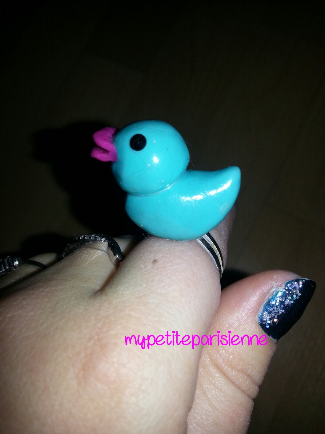Le bracelet avec le petit oiseau j'aime bien. Par contre la bague canard pas du tout ! Je le trouve énorme et n'importe qui d'un peu manuel aurait pu le faire. Juste par curiosité, tu as dépensé combien pour cette étrange bague ? Moi je ne l'aurais pas achetée, personnellement.