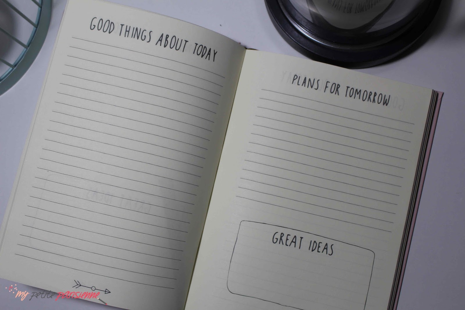 J’ai d’abord vu ce carnet sur les snaps de allgirlslovemakeup et je dois avouer que le concept m’a séduit: Écrire les choses positives de sa journée, ce qui est prévu de sympathique pour le lendemain mais aussi les bonnes idées qu’on a pu avoir dans la journée.