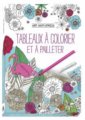 et un deuxième kit pour les accros aux coloriages et les stressés: tableaux à colorier et à pailleter qui contient 6 coloriages, 3 tubes de paillettes 1 pinceau applicateur et une petite pique. ( 12,95€)